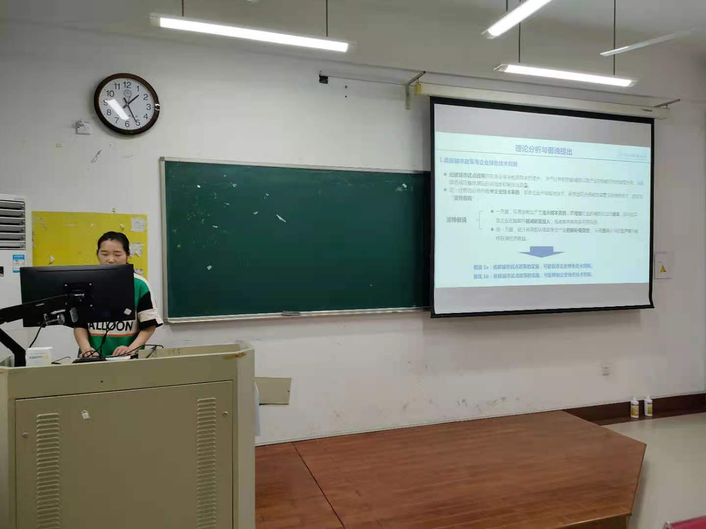 首先,吴婵俊同学汇报的文章题目为《低碳城市和企业绿色技术创新》。文章以国家发展和改革委员会于2010年颁布并逐步扩大试点范围的低碳城市试点政策为背景。探究该政策的实施是否能诱发企业绿色技术创新、以及通过何种影响机制发挥作用。文章基于2005—2015年中国沪深两市A股上市公司的绿色专利申请数据,采用双重差分模型对上述问题进行了多维度实证检验。研究表明,低碳城市试点政策能够在一定程度上诱发企业整体层面的绿色技术创新,且经过一系列稳健性检验,结论依然成立。企业的绿色技术创新效应主要体现在能源节约和替代能源生产两类专利的申请上,试点政策对高碳行业、非国有企业绿色技术创新的诱发作用更为显著。进一步研究发现,命令控制型政策工具是试点政策发挥作用的主要路径,其能够有效促进高碳行业中国有企业和非国有企业的绿色技术创新,且对前者的影响高于后者,而缓解融资约束机制未能得到有效验证。文章为低碳城市试点政策的评估提供了基于企业层面的理论支持和经验证据,并从政策的进一步开展、行业政策制定和不同政策工具运用三个方面提出了政策启示。同学们认真聆听了吴婵俊的汇报,并作了交流讨论。