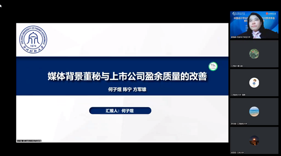 2022年11月26日,由中国会计学会财务成本分会主办、江西财经大学永利yl23411官网承办、《当代财经》杂志社承办的“中国会计学会财务成本分会2022学术年会暨第35次理论研讨会”在线上举行,公司21级审计专业研究生何子煜参加了此次线上会议。本届会议以“新时代背景下财务与会计问题研究”为主题。