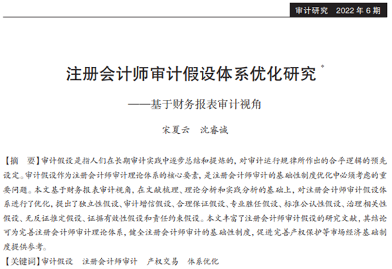 公司研究生沈睿诚与其导师宋夏云教授合作撰写的学术论文“注册会计师审计假设体系优化研究——基于财务报表审计视角”在中文权威期刊《审计研究》2022年第6期发表。