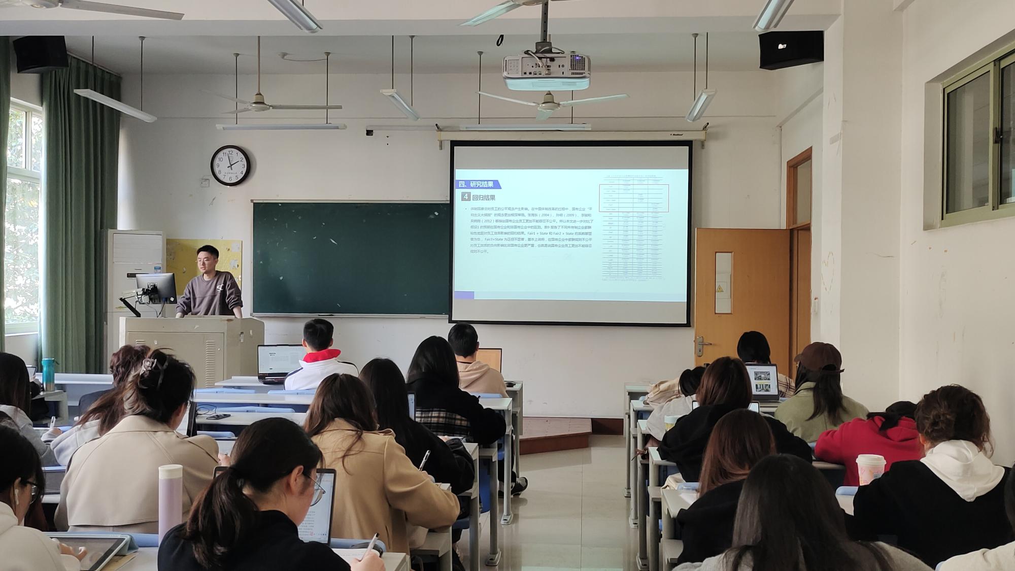其次,王阳民同学进行论文分享,文章题目为《规则公平与员工效率——基于高管和员工薪酬粘性差距的研究》。该文研究发现,企业高管薪酬粘性大于员工薪酬粘性是一种分配规则上的不公平,在此基础上研究发现规则不公平会降低员工效率,同时会减弱薪酬差距对员工的激励效应。这一结果意味着规则公平有利于效率提升,而且是分配结果差异性对效率产生促进作用的必要前提。该文为规则公平的意义提供了一个微观注解。