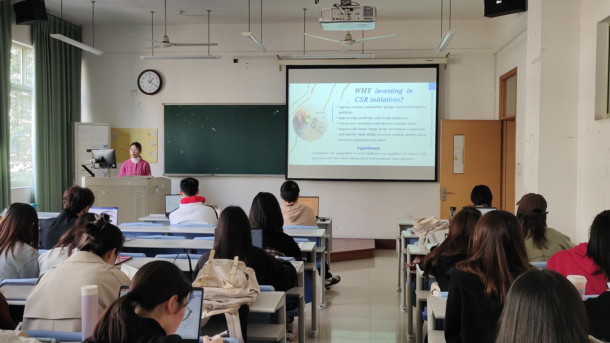 最后,在两位同学汇报之后,两位老师做出了精彩点评。史文博士、桂美增博士就王淇同学的分享提出以下建议:第一,仔细思考ESG和CSR是否有关系;第二,可以尝试换切入点,比如不同文化对该研究是否有影响。老师们也针对王阳民同学的分享提出了以下几个建议:第一,尽量减少PPT中的文字,提炼精要内容;第二,尽量选取近三年的文献进行分享,增加对该研究的参考意义;第三,老师们鼓励同学们在未来介绍自己的文章以供老师们进行点评。