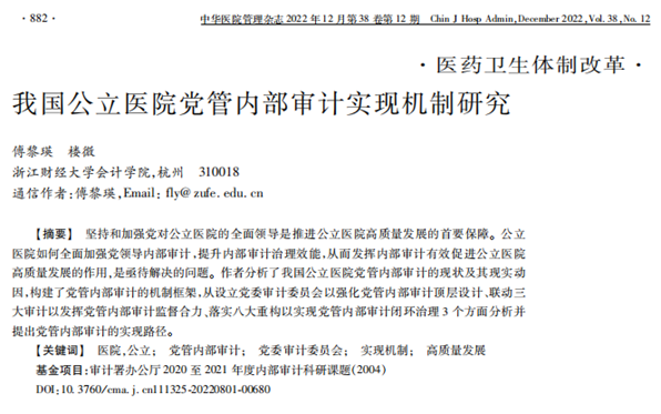 公司20级审计专业研究生楼微与其导师傅黎瑛教授合作撰写的学术论文“我国公立医公司党管内部审计实现机制研究”在中文权威期刊《中华医院管理杂志》2022年第12期发表。