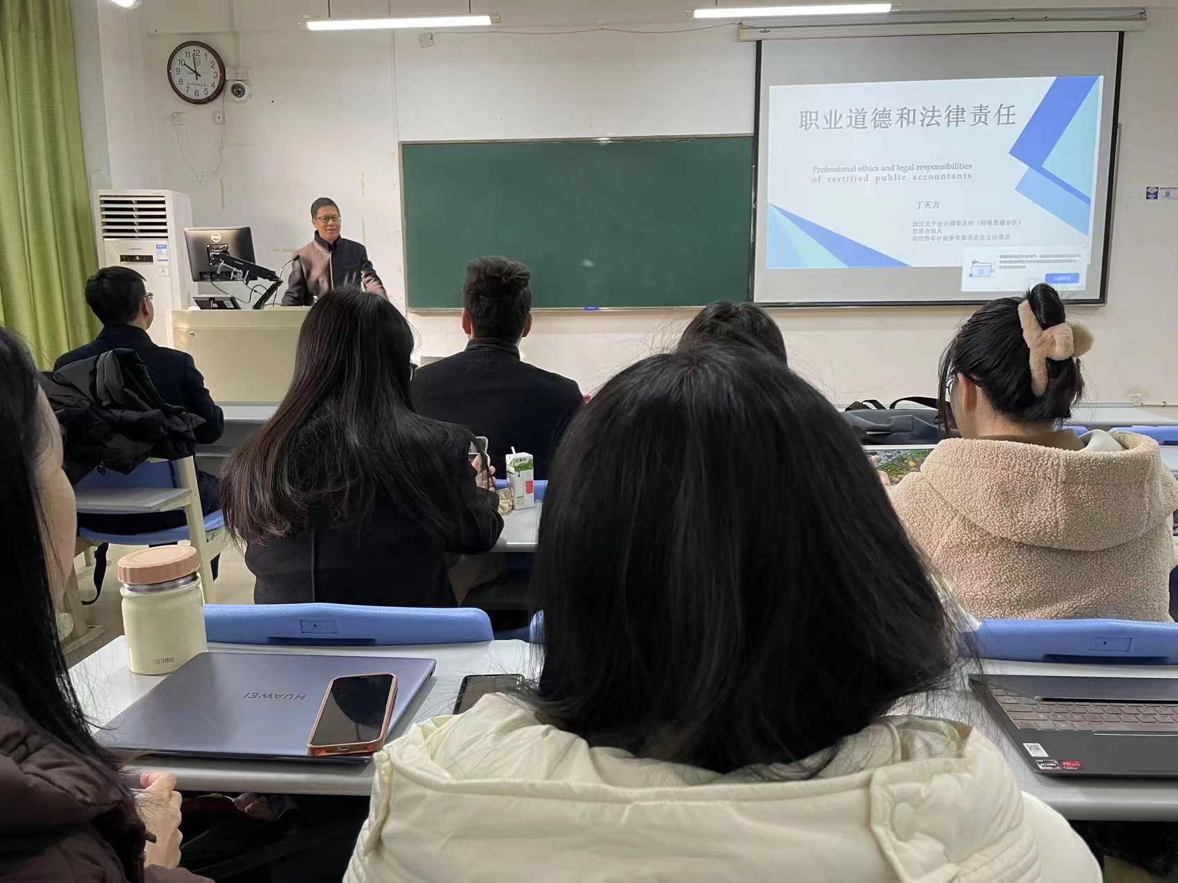 2023年12月20日上午,社会导师丁天方在永利yl23411官网105教室为2022级审计专业硕士研究生做了“职业道德与法律责任”的专题讲座。