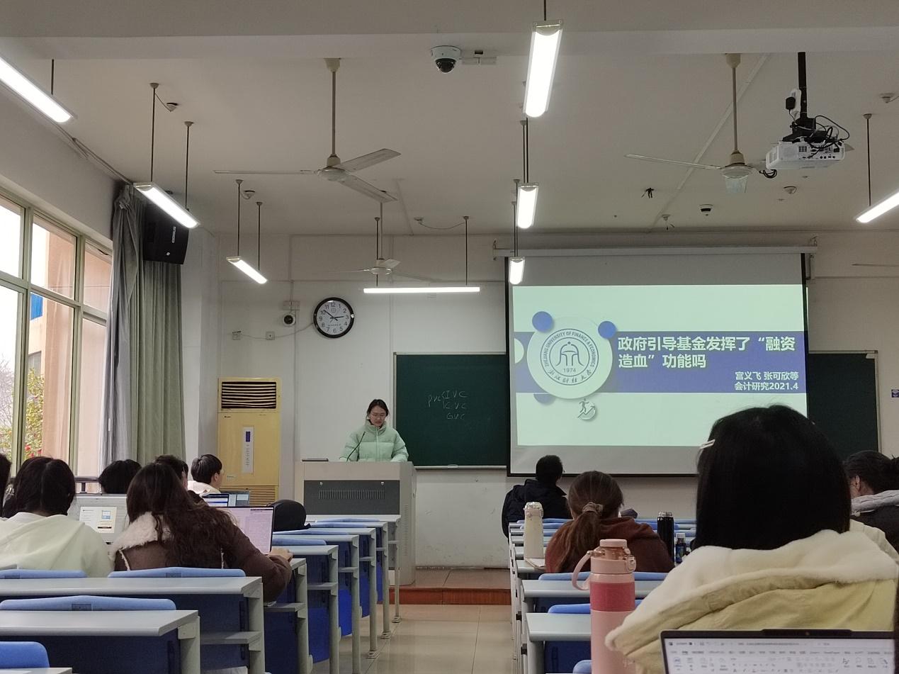 其次,马欣慧同学分享论文《政府引导基金发挥了“融资造血”功能吗》。该文研究发现政府引导基金,作为政府推动产业结构调整,构建经济增长新动能的宏观政策工具,可以有效缓解企业的融资困境,为企业“融资造血”。这种作用效果在被出具标准无保留意见的企业与市场化程度较高地区的企业更为显著。进一步研究发现,政府引导基金能够通过“信号传递”效应,缓解信息不对称程度以及降低企业信贷资本成本的方式发挥“融资造血”功能。经济后果研究发现,政府引导基金不仅发挥了“融资造血”功能,还极大的促进了企业的研发创新。