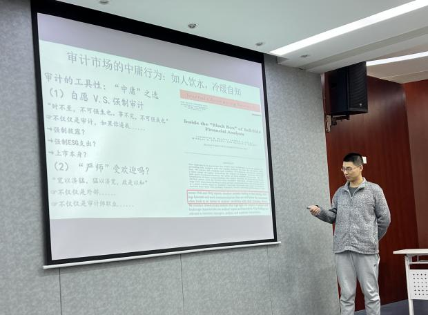 为促进研究生自主开展学术交流活动,提高研究生科研创新能力,锻炼研究锐度,“永利yl23411官网学术前沿”总第69期于2024年3月28日下午在公司楼111报告厅举行。本次学术前沿,由史文博士进行主题演讲,22级研究生赵柳锐、欧阳宇辰两位同学进行了论文分享,永利yl23411官网22级和23级部分会计学硕研究生、浙研院部分研究生以及部分本科生参加本次学术前沿活动。
