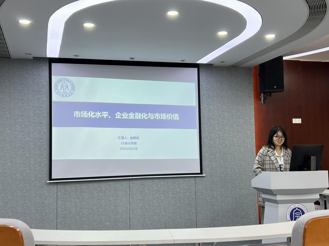 然后,赵柳锐同学分享论文《市场化发展水平、企业金融化与市场价值》。该论文研究发现,企业金融化程度越高,越有利于提升企业市场价值,但该正相关程度将随着地区市场化水平上升而受到削弱。上述研究结论经过一系列稳健性检验后依然成立。进一步检验发现,上述影响主要存在于非房地产企业、非国有企业、融资约束程度较高、媒体关注度较低及机构投资者持股比例较低的企业中。研究表明,对于我国非国有类非房地产企业,在市场化水平较低地区适量增加金融资产持有比例可以起到一定程度“蓄水池”作用并有利于提升企业市场价值;而在市场化水平较高地区,上述配置程度越高则会抑制正向影响。
