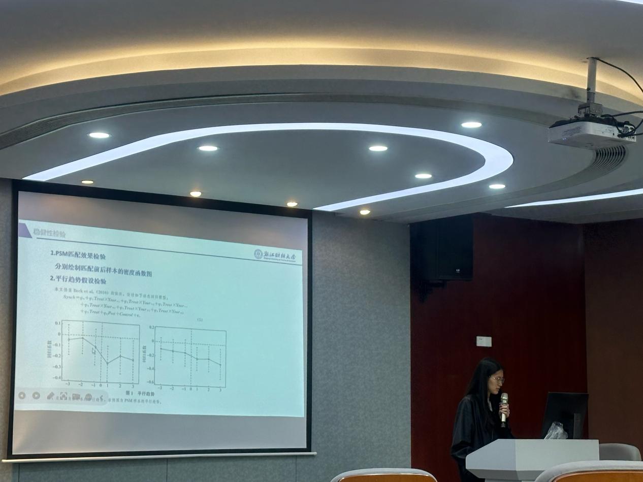 最后,单雨恬同学进行论文分享,文章题目为《中小投资者保护制度创新与资本市场定价效率提升———基于投服中心行权的证据》。该文研究发现,第一,投服中心行权有助于提高资本市场定价效率;第二,采用参加股东大会、重大资产重组媒体说明会以及用网上问询方式行权时,投服中心行权对资本市场定价效率的影响越显著;第三,投服中心行权问题数量越多、问题信息含量和问题定量信息含量越高时,以及上市公司回复投服中心问题的数量越多、回复信息含量和回复定量信息含量越高时,投服中心行权所发挥的作用越显著;第四,投服中心行权通过信息渠道和治理渠道来提高资本市场定价效率,即在信息环境或治理环境薄弱的企业中,投服中心行权对资本市场定价效率的影响更显著。