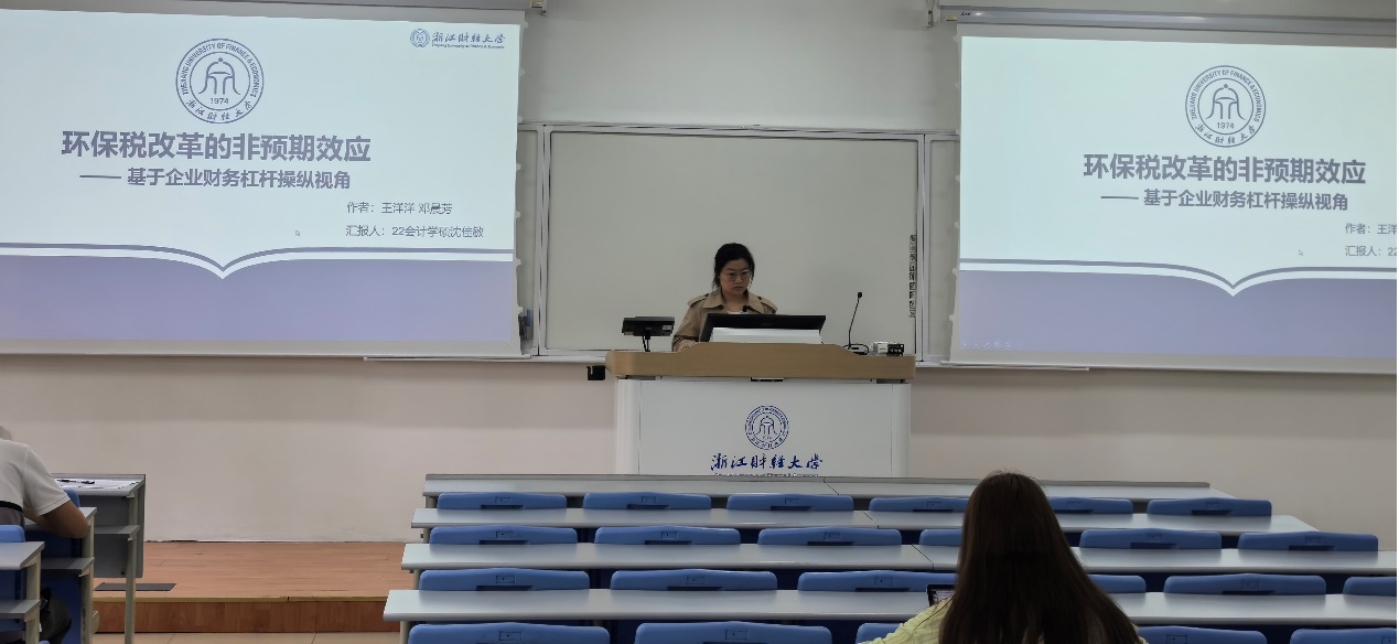 最后,沈佳敏同学进行论文分享,文章题目为《环保税改革的非预期效益——企业财务杠杆操作视角》。沈佳敏同学指出解决环境问题是实现经济高质量发展的必要举措,目前企业为了实现利润最大化,倾向于将资金用于营利活动,进而指出本文的背景与缘由。随后对杠杆操纵行为、非预期效益等名词进行解释,提出文章的边际贡献——拓展了环保税改革的微观经济后果研究等,通过对现有生产经营行为、投资行为等方面的文献综述,提出文章假设与逻辑。在实证研究部分除主回归之外,还进行了稳健性(安慰剂等)、机制检验(创新压力、遵循成本和融资劣势)和异质性分析。最后,引出文本结论—环保税实施显著提高了企业的财务杠杆操纵程度,并提出相应政策启示。