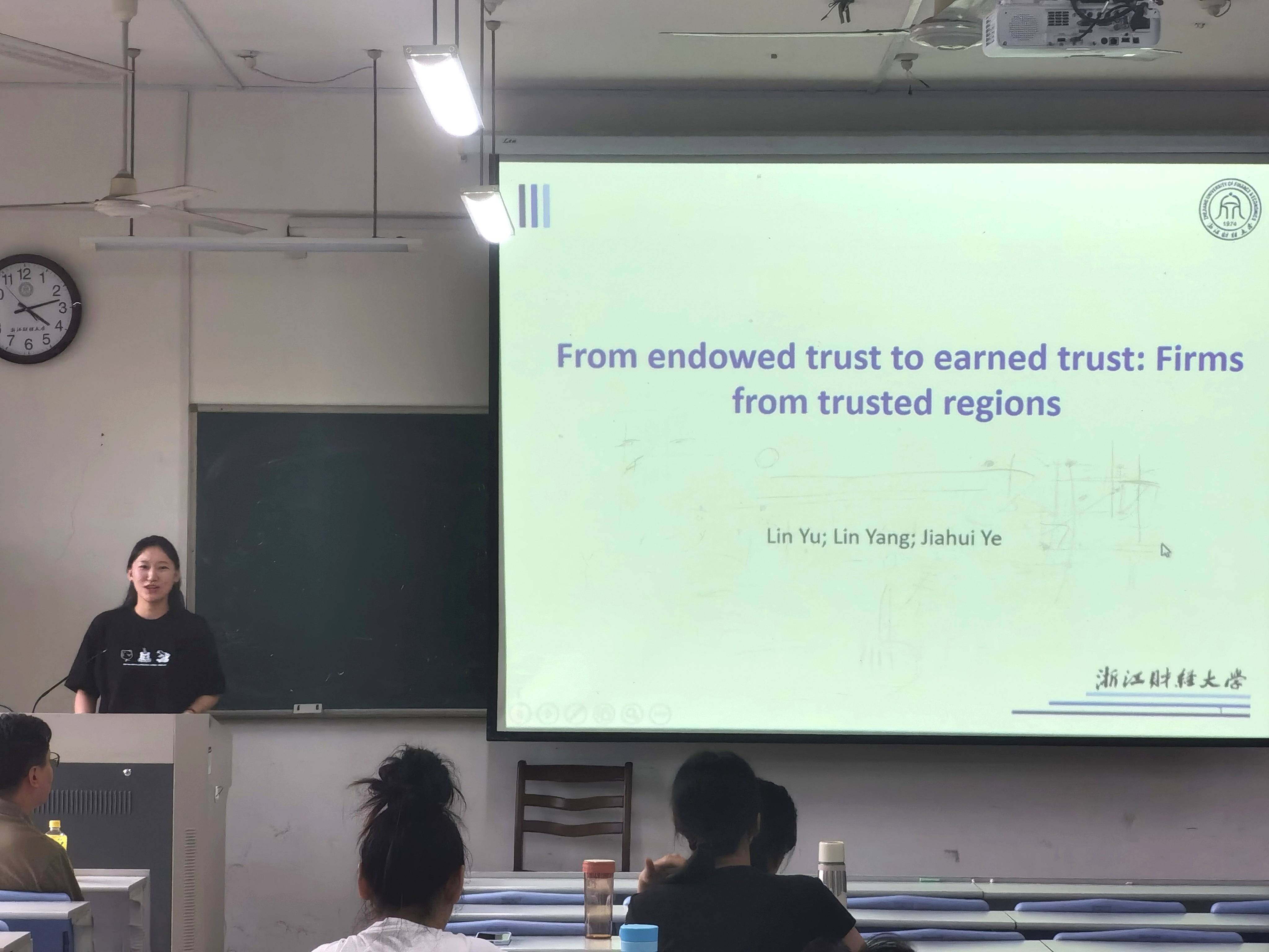 其次,杨琳同学分享论文《From endowed trust to earned trust: Firms from trusted regions》。杨琳同学指出,论文主要的内容是依据合法性理论,预计位于高度可信区域可能与较好的环境和社会绩效相联系。她提出了文章的假设,即处于社会信任更高的公司,会在社会环境方面投入更多。接着,杨琳同学介绍了文章的概念框架,其中自变量为社会信任,因变量为 E&S 指标,中介变量为诉讼风险和融资约束,调节变量为法律环境和公司治理。基于此,文章以 2009 年至 2021 年间的中国企业为样本,实证检验了社会信任对 E&S 的影响。