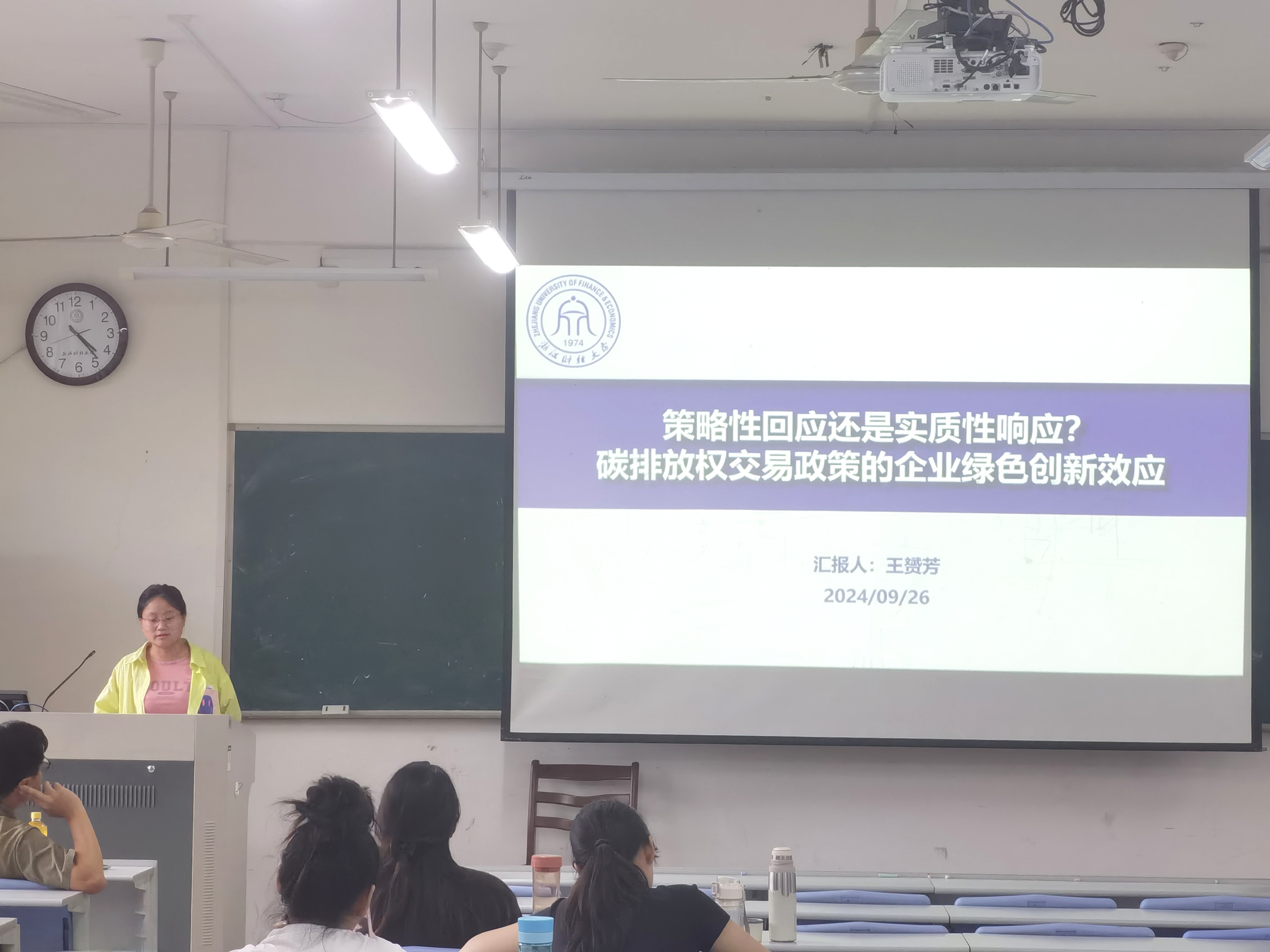 最后,王赟芳同学进行论文分享,文章题目为《策略性回应还是实质性响应?碳排放权交易政策的企业绿色创新效应》。王赟芳同学指出“波特假说”理论认为,设计完善的环境规制能能激励企业实施创新,进而通过创新提高其竞争力,这也意味着环境规制能够诱发创新补偿效应,但创新补偿效应和道循成本效应都可能存在,还需对创新进一步细分研究,进而指出本文的背景与缘由。随后,文章对现有文献进行分析,得出需要进一步深入研究碳排放权交易究竟能否及任何促进企业绿色创新的结论。使用双重差分法,应用相关检验、异质性分析、机制分析进行研究。最后,引出文本研究意义,并提出相应的政策启示。