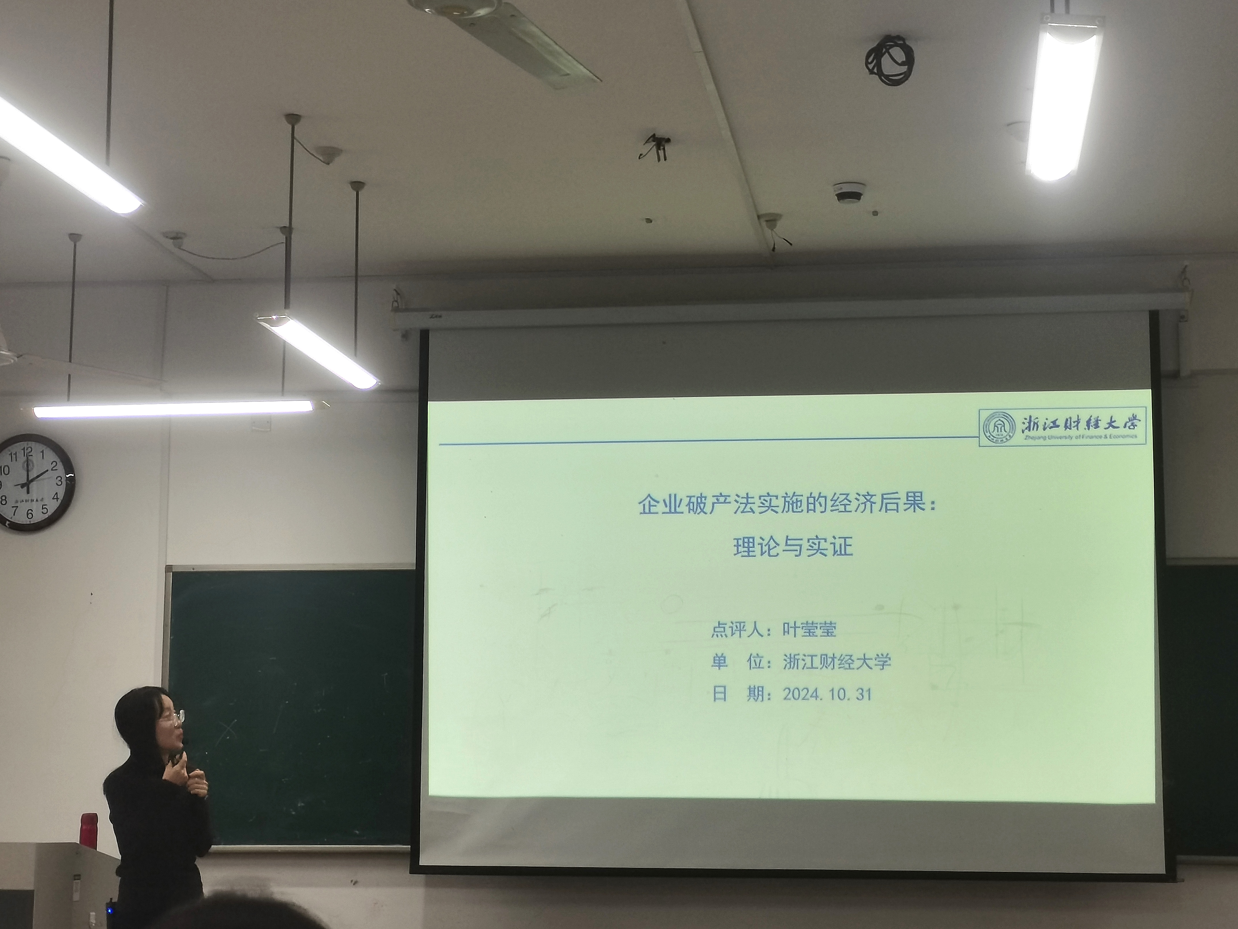 最后,史伟旗同学进行论文分享,文章题目为《破产法庭设立、债权人保护与地方性商业银行风险》。史伟旗同学首先对文章内容进行了介绍,阐述了文章来源及作者信息,随后对文章的具体内容进行了细致的讲解。最后,引出本文结论,如:破产法庭的设立通过提高司法事判的质效,降低了公司进入破产程序后的破产成本,增强了市场退出环节对做债权人利益的保护,从而显著降低了地方性商业银行的风险,并提出相应政策启示。文章拓展了公司破产环节法律制度与金融发展、商业银行风险和信贷资源配置影响因素相关的相关文献。为政府和监管部门评估供给侧结构性改革的举措和效果提供了决策参考。