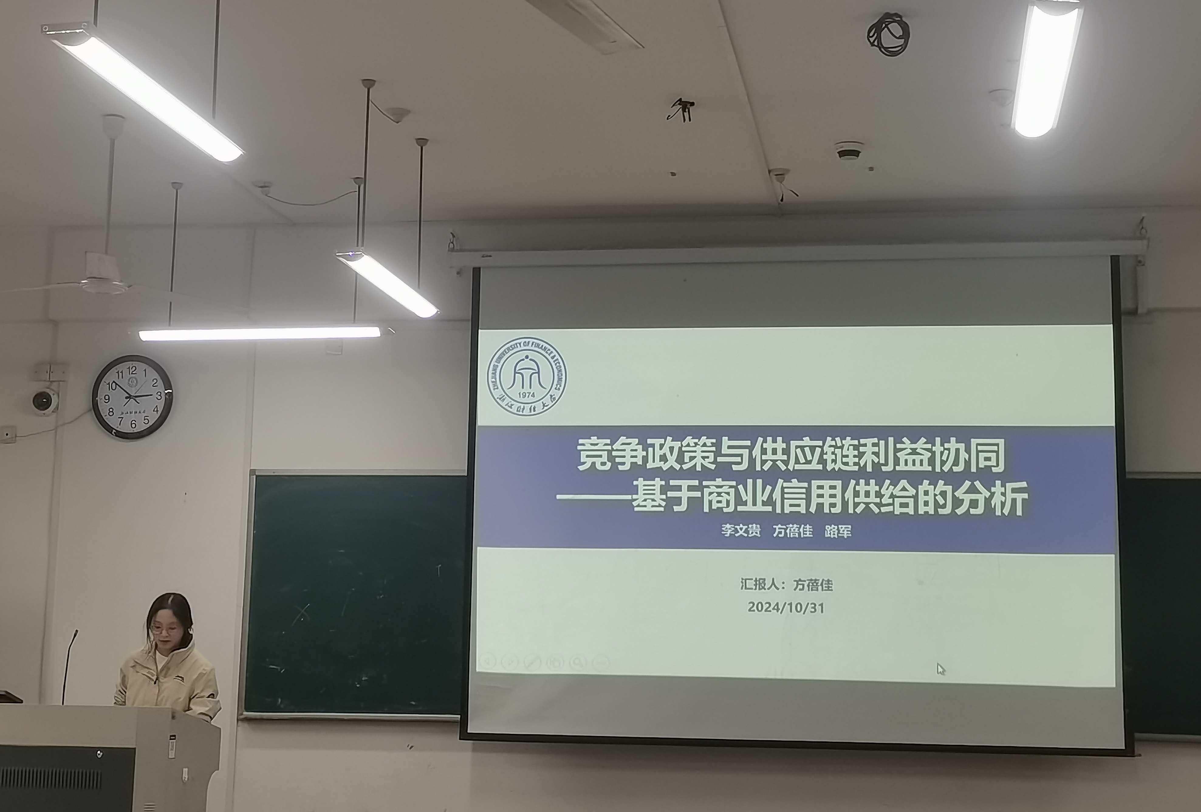其次,方蓓佳同学分享论文《竞争政策与供应链利益协同——基于商业信用供给视角的分析》。方蓓佳指出商业信用是指在商品交易中由于延期付款或预收货款所形成的企业间的借贷关系,有利于促进供应链整体的利益协同。文章表明,竞争政策非但未能提升反而在一定程度上减少了国有企业的商业信用供给,应避免出现“选择性执法” 等问题而带来执法过程的不公平。研究发现,构建更具竞争性的产品市场环境有助于缓解高垄断企业的商业信用供给不足并带来供应链利益协同。文章借助实证分析的方法,进一步加深了企业对商业信用供给经济后果的认识。