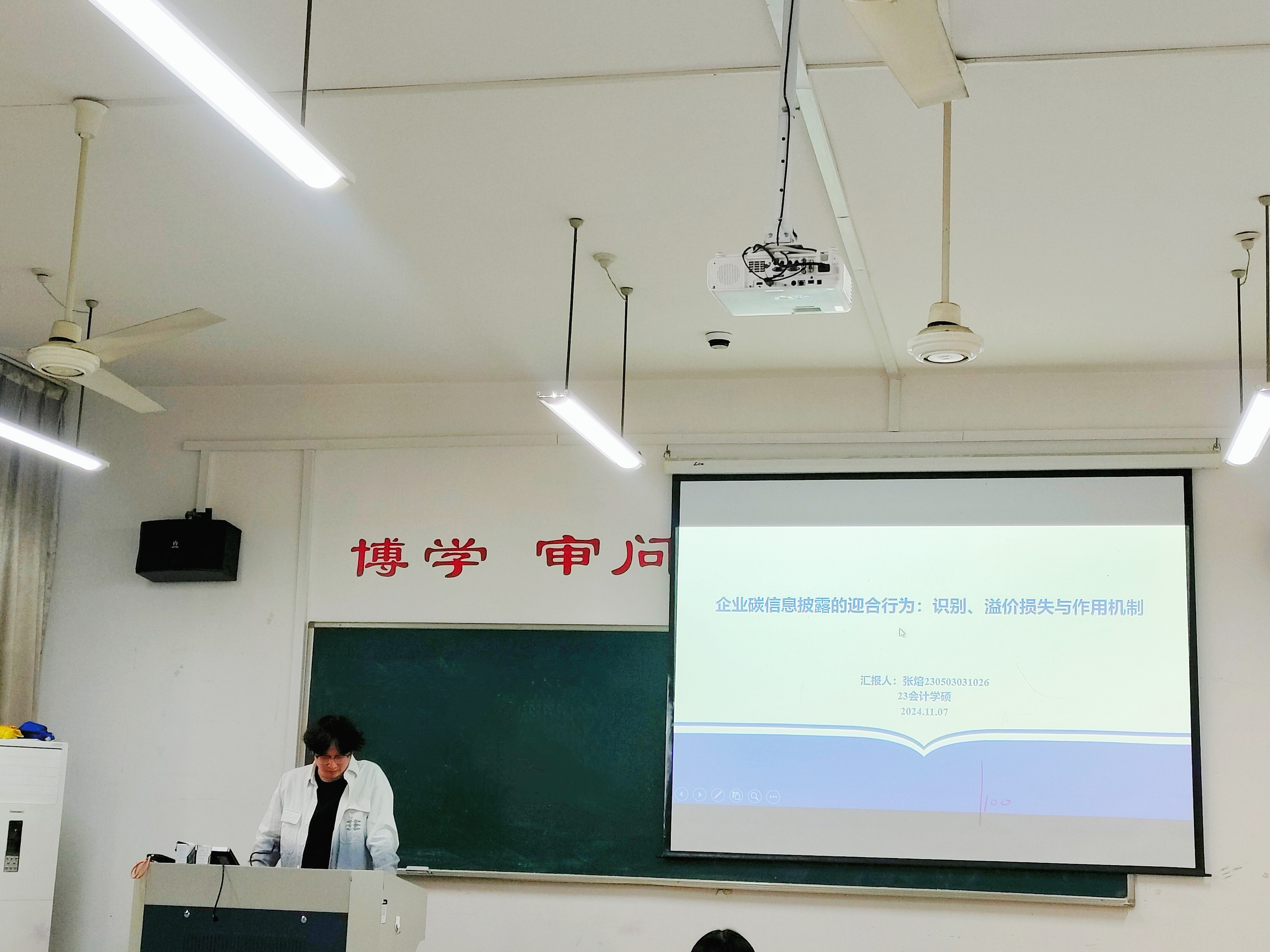 最后,张熔同学进行论文分享,文章题目为《企业碳信息披露的迎合行为:识别、溢价损失与作用机制》。张熔同学首先向我们介绍了相关概念:碳信息披露是指在企业社会责任信息中披露的与减碳相关的部分。迎合行为是指向外界披露碳信息却并不付诸与之相应的实际减碳行动。溢价损失是指迎合行为对碳信息披露溢价的负面效应。接着,张熔同学向我们介绍了模型假设和模型推导,并引出四个假说,假说1:在碳信息披露的过程中,企业存在言过其实的迎合行为。假说2:迎合行为会对谈信息披露的溢价造成负面影响,带来溢价损失。假说3a:迎合行为通过抑制碳信息披露对投资者信心的提升作用带来溢价损失。假说3b:迎合行为通过抑制碳信息披露对债务融资水平的促进作用带来溢价损失。最后,根据理论假说进行了实证研究、溢价效应检验、稳健性分析、作用机制检验和异质性检验,最终得出碳信息披露能够显著提高上市公司股票回报率,由此带来的碳溢价驱使企业在碳信息披露过程中"言过其实"的研究结论。