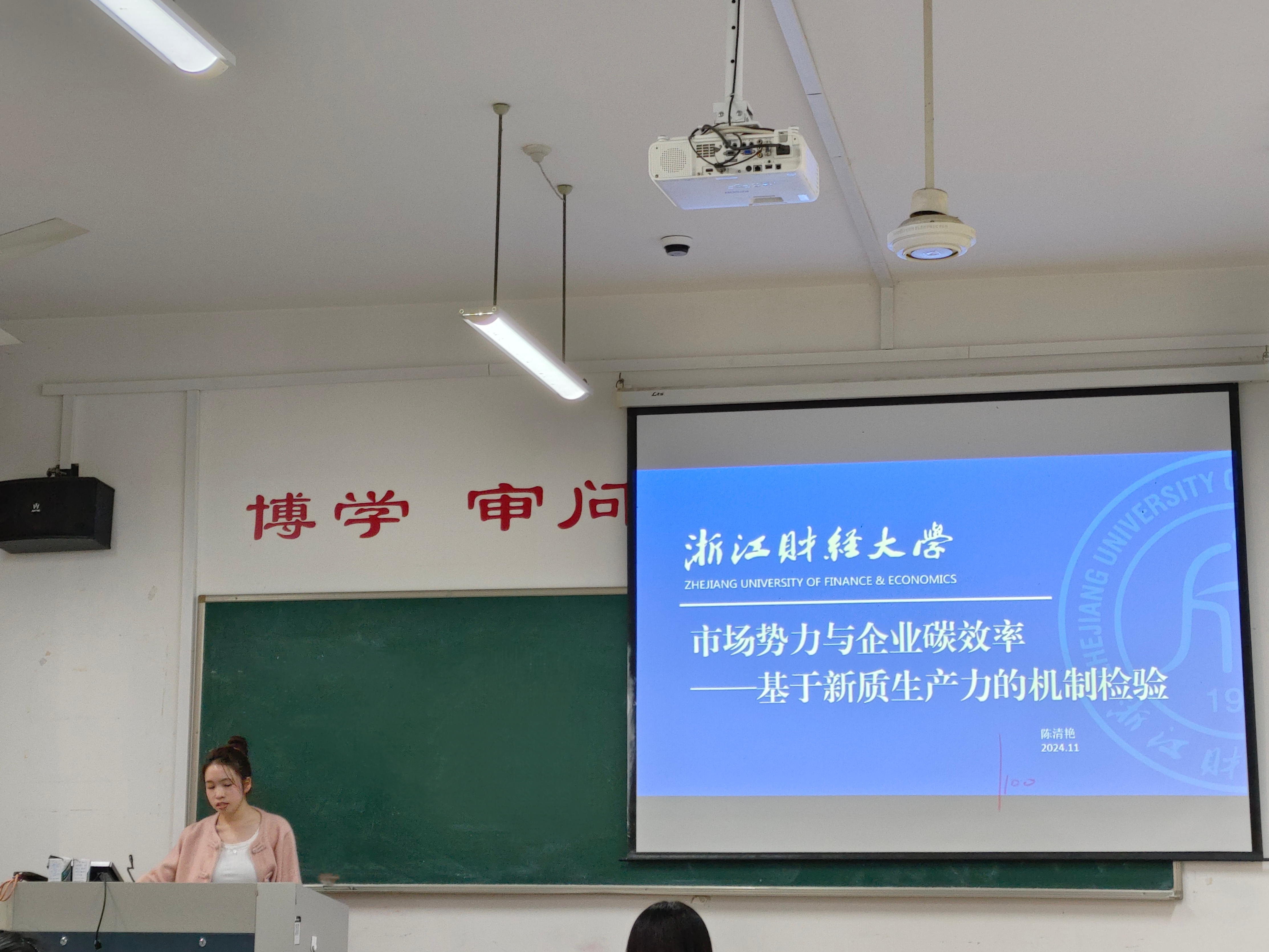 其次,陈清艳同学向我们介绍了论文《市场势力与企业碳效率——基于新质生产力的机制检验》,首先在引言部分,陈清艳同学提到无论是在2020年9月的第75届联合国大会上,党的二十大还是在2024年1月的中共中央政治局第十一次集体学习上,习近平总书记都提到了绿色发展与双碳目标。这篇论文的理论假设是H1:市场势力对企业碳效应具有显著的正向促进效应;H2:市场势力对企业碳效应具有显著的负向抑制效应。接着构建了回归模型,核心解释变量是市场势力,被解释变量是碳效应,选择了企业规模(Size)、环境规制强度(ER)、资本集约度(Capint)、设备更新率(New)、资产负债率(Lev)作为本文控制变量,并进一步进行了稳健性检验和异质性分析,发现企业市场势力对企业碳效应之间具有显著的正相关关系,且这种作用体现在新质生产力的提升上。