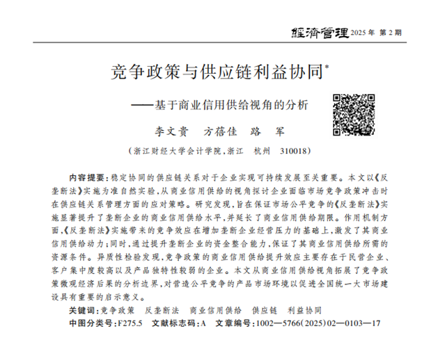 公司研究生方蓓佳与其导师李文贵教授、路军副教授合作撰写的学术论文“竞争政策与供应链利益协同——基于商业信用供给视角的分析”在一级期刊《经济管理》2025年第2期发表。