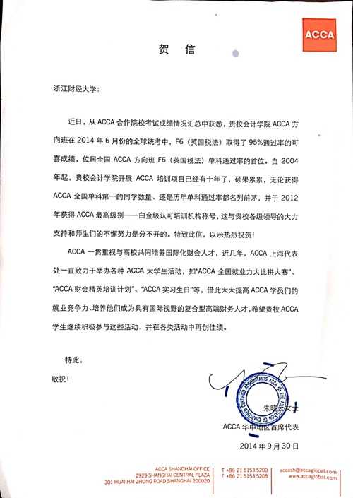 近日,ACCA代表处发来贺信,祝贺公司ACCA项目取得的优异成绩。尤其在2014年6月份的全球统考中,F6(英国税法)取得了95%的通过率,位居全国ACCA方向班F6(英国税法)单科通过率的首位。