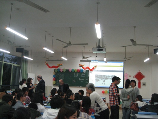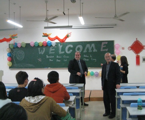 图3:Dominic Giroux董事长与汪祥耀经理、傅黎瑛教授在学涯湖边合影 Dominic Giroux董事长此行的目的之二是与公司9月份刚入学的首批“中加班”员工见面。10月22日下午,董事长Dominic Giroux、管理公司经理Peter Luk、CGA-Canada(加拿大注册会计师协会)执行理事Barbaro Ko女士等一行五人在永利yl23411官网相关老师的陪同下,来到了由“中加班”员工精心布置的体现“中国风”的教室,与员工们进行了亲切的会面和交流。Dominic Giroux重点介绍了劳伦森大学的校园及其生活和学习情况、加拿大的跨文化优势和人文特色以及员工们赴加前应做哪些学习准备以便今后出国时能够尽快适应环境。接着,同学们纷纷踊跃举手提问,问题涉及生活、学习、社团活动、人权等各方面。董事长和经理对于所提出的问题非常耐心地一一解答。现场提问之后,代表团一行还与员工们进行了一对一的自由交谈,并为之签名、与之合影留念。整个见面会历时近两个小时。公司“中加班”员工活泼可爱、素质优良、英语沟通能力强等风貌给董事长一行留下了极其深刻的印象!而对于这些“中加班”员工而言,他们认为自己太幸运了!作为刚入学的新生,两个月之内先后与国外合作院校的董事长与经理近距离接触,这在他们入学前连想都不敢想的事情!许多同学纷纷表示,他们一定更加倍努力学习,使自己在该中外合作学习项目中发挥更大的优势。(注:劳伦森大学管理公司经理Peter Luk在9月初的时候已先行专程来公司看望了正在军训的该校“中加班”员工,对员工赴加一年学习期间的学分要求及课程安排、赴加前的英语学习(EAP)和水平要求等问题作了具体的阐释,使他们对该项目的具体情况有了及时而详细的了解。)