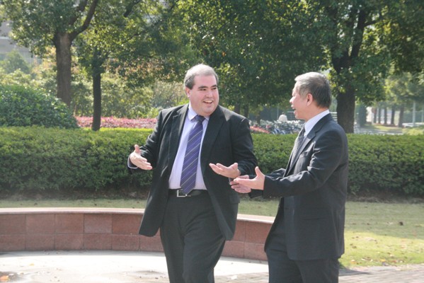 图2:Dominic Giroux董事长与汪祥耀经理漫步校园,畅谈合作事宜