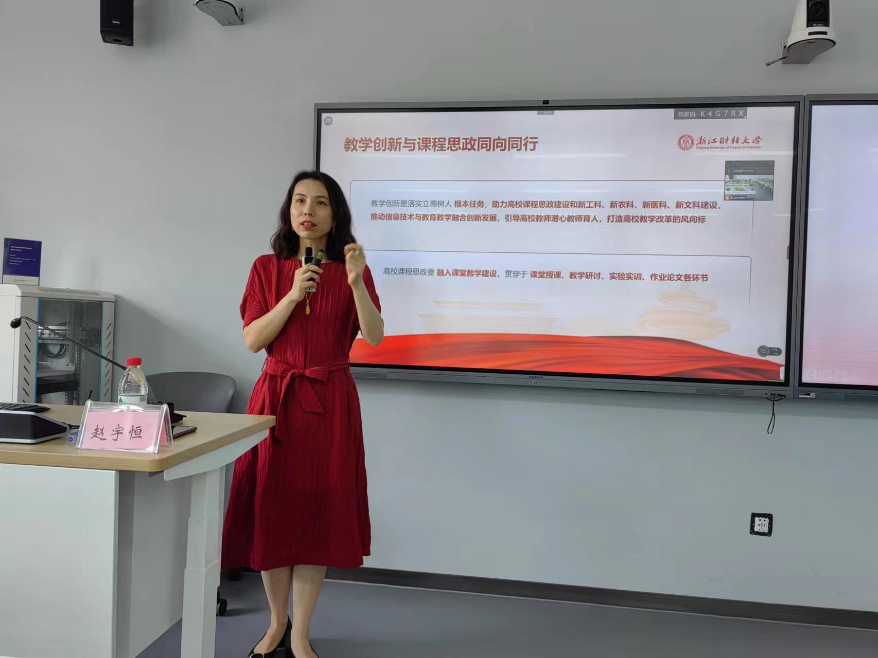 赵宇恒老师首先介绍了本次讲座主题的原因。基于对员工的访谈,她发现,目前高校课程思政已在各门课程中全面推进,但不同课程推进程度不同,相较于通识课和公共基础课,专业课中的高阶课程因知识复杂、难度系数高而存在思政元素融入的困境。而2021年首届全国高校教师教学创新大赛的举办,通过教学改革,掀起学习革命,最终实现立德树人的根本任务。可见课程思政与教学创新同向同行,为解决高阶课程思政元素融入提供了新思路。