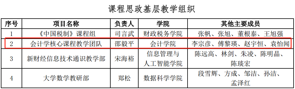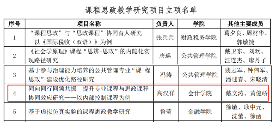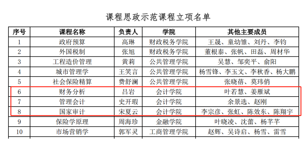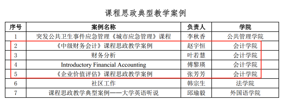 经公司推荐,专家组评审,公司确定立项建设2021年课程思政示范基层教学组织 4个、课程思政示范课程 29 门、课程思政教学研究项目 24 项、课程思政示范教师 10 个、课程思政典型教学案例 7 个。其中,公司邵毅平老师负责的会计学核心课程教学团队获课程思政示范基层教学组织立项,吕岩老师负责的《财务分析》课程、史开瑕老师负责的《管理会计》课程及宋夏云老师负责的《国家审计》获课程思政示范课程立项,高汉祥老师负责的“向同行同频共振 提升专业课程与思政课程协同效应研究——以内部控制课程为例”项目获课程思政教学研究项目立项,赵宇恒老师获“课程思政示范教师”荣誉称号,赵宇恒老师的《中级财务会计》“课程思政教学案例”、叶若慧老师的“财务分析”、傅黎瑛老师的“Introductory Financial Accounting”、张芳芳老师的“《企业价值评估》课程思政教学案例”入选课程思政典型教学案例。